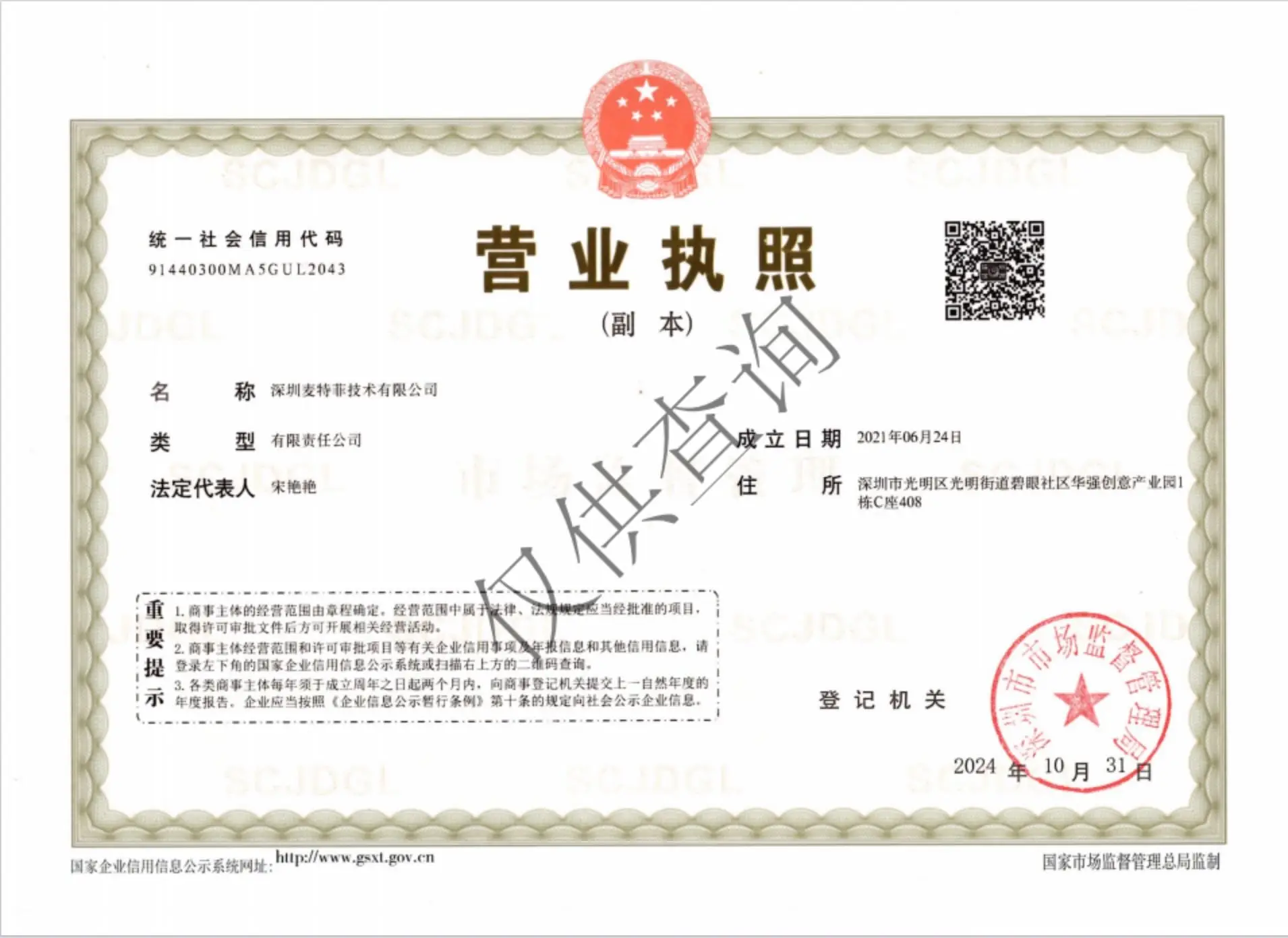 Registered address : 408, Block C, Building 1, Huaqiang Creative Park, Biyan Community, Guangming Subdistrict Shenzhen Guangdong China